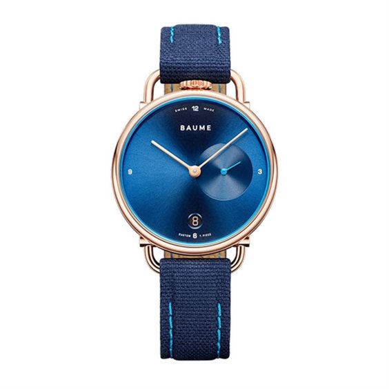 OROLOGIO BAUME ET MERCIER BAUME CASSA ACCIAIO DORATO ROSA CON CINTURINO IN TESSUTO BLU E QUADRANTE BLU