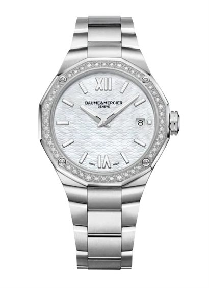 Baume & Mercier presenta un altro Riviera ultra-femminile nel 2022, dal diametro di 36 mm e dotato di movimento al quarzo, quadrante in madreperla bianca, bracciale in acciaio integrato e lunetta impreziosita da 44 diamanti incastonati a neve, fissata da quattro viti in acciaio lucido. In questa versione, il Riviera si rivolge alle donne alla ricerca di un orologio prezioso che sia elegante, bello e semplice. Un lusso discreto perfettamente rappresentato dalla Maison.