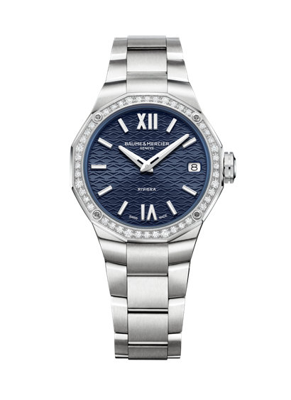 Baume & Mercier Riviera, acciaio con lunetta acciaio lucida e satina con finitura soleil impreziosita da 44 Diamanti; quadrante blu notte e bracciale acciaio. Cassa 33mm, movimento al quarzo e Diamanti certificati Top Wesselton qualità VS 0.47Ct