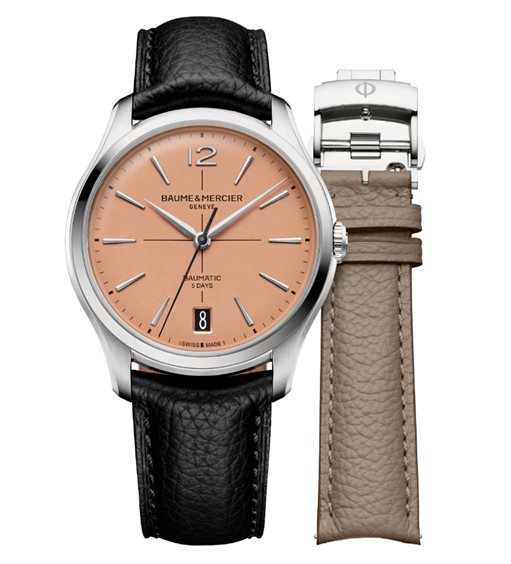 Il Clifton 10778 ha una cassa rotonda in acciaio inossidabile lucido-satinato e si aggiunge alla collezione in un formato di 39 mm. La cassa presenta una corona in acciaio inossidabile e un fondello aperto in zaffiro. Il quadrante opalino salmone, bordato da una minuteria e da un mirino neri, mette in evidenza il numero arabo a ore 12, gli indici rodiati e sfaccettati rivettati a forma di trapezio e le lancette a forma di alfa. È dotato di un movimento Baumatic a carica automatica (BM13-1975A) con riserva di carica di 5 giorni e impermeabilità fino a 5 ATM. Il cinturino intercambiabile in pelle di vitello nera e il cinturino aggiuntivo in pelle di vitello beige sono dotati di un affidabile sistema di sostituzione senza attrezzi.