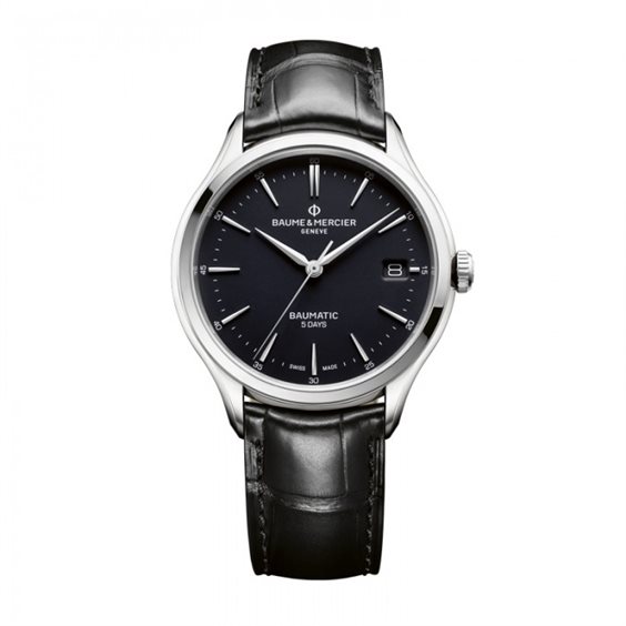 Clifton Baumatic 10399 OROLOGIO A CARICA AUTOMATICA CON MOVIMENTO BAUMATIC Il Clifton Baumatic 10399 è un segnatempo di 40 mm con data che vanta un’estetica raffinata. Il cinturino in pelle di alligatore nera, intercambiabile, e il quadrante nero esprimono carattere e forte personalità. La lunetta in acciaio inossidabile e le lancette rodiate caratterizzano un segnatempo perfetto per il professionista moderno dalla personalità decisa. Orologio automatico con finestrella della data a ore 3 e fondello trasparente in vetro zaffiro. CARATTERISTICHE Orologio Automatico, carica automatica Riserva di carica: 120 ora/e Impermeabilità: 5 ATM (circa 50 metri) Data Fondello in vetro zaffiro MOVIMENTO Swiss Made Baumatic BM12-1975A Energia Automatico, carica automatica Frequenza 28800.0vph/4.0hz CASSA Forma Rotonda Misura Diametro: 40 mm Spessore 10.5 mm Materiale e finiture Acciaio, Lucido satinato Fondello Fondello in vetro zaffiro, Con viti QUADRANTE Colori e finiture Nero, Simil porcellana Indici indici rivettati Lancette Placcato rodio, Alpha CINTURINO Materiale Pelle di alligatore, Nero Fibbia Fibbia ad ardiglione, Lucida finiture