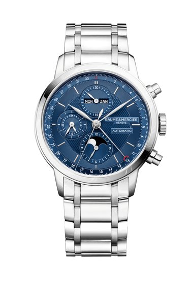 OROLOGIO BAUME ET MERCIER CLASSIMA, CRONOGRAFO CALENDARIO COMPLETO, CASSA IN ACCIAIO QUADRANTE CON INIDCAZIONI CRONOGRAFO E CALENDARIO CON FASI LUNARI, BRACCIALE ACCIAIO. MOVIMENTO AUTOMATICO
