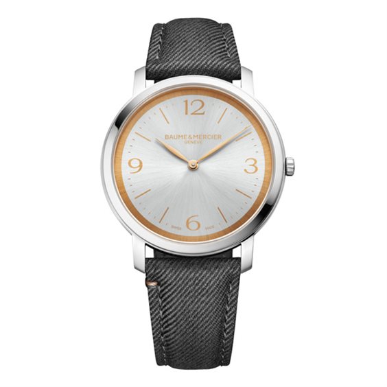 OROLOGIO BAUME ET MERCIER CLASSIMA MODELLO 10703. QUADRANTE ARGENTO SATINATO CON DECORO SOLEIL E REHAUT DORATO CON NUMERI ARABI, INDICI E LANCETTE A FOGLIA DORATE. CINTURINO IN TESSUTO GRIGIO SCURO (SUPER 120)