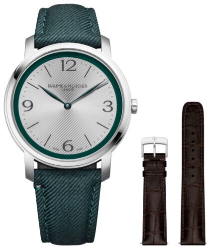 OROLOGIO BAUME ET MERCIER CLASSIMA M0A10705 42MM, QUADRANTE ARGENTATO, REHAUT VERDE E DECORO A LINEE DIAGONALI. CINTURINO IN TESSUTO VERDE (SUPER 100) CON CUCITURE