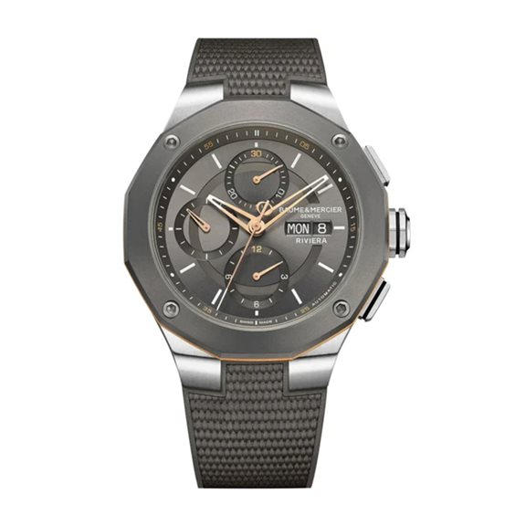 Dotato di un movimento automatico Valjoux, questo Riviera presenta un quadrante grigio ardesia satinato a raggi di sole e un cinturino in caucciù grigio con decorazione in tela. Caratterizzato da una lunetta in titanio sabbiato impreziosita da un anello d'oro, questo segnatempo è perfettamente in linea con la tradizione cronografica della Maison. Con la sua cassa in acciaio di 43 mm di diametro e la lunetta dodecagonale in titanio sabbiato, fissata da quattro viti in acciaio sabbiato, questo segnatempo dal carattere forte dà il tono fin dal primo sguardo: passione per l'azione. Ultimo nato della collezione Riviera, questo cronografo, impermeabile fino a 100 metri, è animato da un movimento meccanico a carica automatica di alta qualità Swiss Made e visualizza il giorno e la data in due finestrelle orizzontali a ore 3.