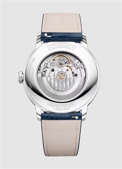 Il Classima 10879 si distingue per la cassa rotonda in acciaio lucido da 40 mm, espressione di eleganza senza tempo. La corona e il fondello aperto in vetro zaffiro, che lascia intravedere il movimento, completano il segnatempo con discrezione. Il quadrante blu con finitura satinata soleil e decorazione grain d’orge valorizza i numeri romani e gli indici rodiati, insieme alle lancette a foglia rodiate, per un’estetica raffinata e armoniosa. A ore 3 si inserisce il datario, che completa l’insieme con equilibrio. Animato da un movimento automatico (Sellita SW200), offre una riserva di carica di 38 ore e un’impermeabilità fino a 5 ATM. Il cinturino intercambiabile in pelle di vitello blu scuro con motivo alligatore è dotato di un sistema pratico e affidabile che ne consente la sostituzione senza l’uso di strumenti.