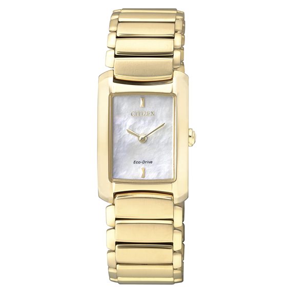 Orologio solo tempo.Cassa tonneau acciaio lucido PVD oro giallo, dimensioni 20x30mm. Movimento al quarzo ore e minuti Eco-Drive (a carica luce infinita) riserva di carica 8 mesi. Vetro zaffiro. Quadrante madreperla,lancette ed index lucidi oro .Bracciale regolabile in acciaio PVD oro giallo spazzolato centrale, fianchi lucidi,chiusura 'a scomparsa'a farfalla con pulsanti. Impermeabile 5 atm.