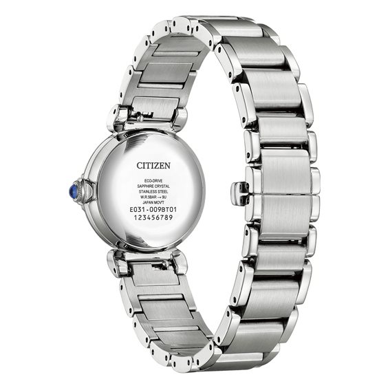 Orologio Donna solo tempo collezione Maybell Mini. Cassa in acciaio lucido , corona con pietra cabochon blu. Movimento Eco-Drive a carica luce con riserva di carica 180 giorni. Vetro zaffiro leggermente bombato. Quadrante verde con cifre arabe e lancette lucide. Bracciale regolabile in acciaio lucido con chiusura deployante con pulsanti. Impermeabile 5 bar(5 atm). Scatola e libretto Originali. Garanzia 5 anni.