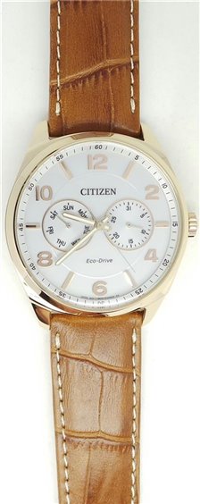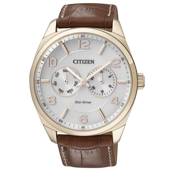 Orologio con cassa in acciaio, diametro 43 mm e fondo serrato a vite. Movimento Eco-Drive (a carica luce infinita) con riserva di carica di 180 giorni. Doppio datatrio. Cinturino in morbida pelle marrone con cuciture beige. WR 10 bar.