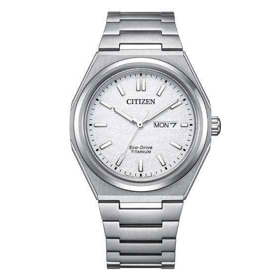 Orologio Solo Tempo Uomo Collezione Super Titanio 0130. Cassa e bracciale realizzati in titanio Grado 2 lavorato con la tecnologia esclusiva Citizen Duratec che conferisce un elevato livello di finitura estetica attraverso l’alternanza di superfici lucide e spazzolate e al tempo stesso ne incrementa la resistenza all’abrasione di oltre 5 volte rispetto all’acciaio inox. Movimento Eco-Drive a carica luce infinita con riserva di carica di 180 giorni. Quadrante colore bianco-ghiaccio con pattern materico ispirato alla granulometria tipica del titanio indici e lancette luminescenti, day-date a ore tre. Vetro zaffiro. Bracciale regolabile chiusura deployante con pulsanti . Impermeabile 10 bar (atm).Scatola libretto e garanzia 5 anni originali.