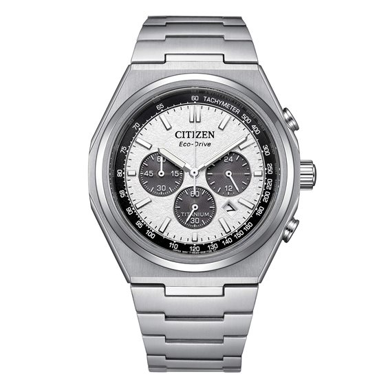 Orologio Cronografo Uomo Collezione Crono Super Titanio 4610. Cassa Cassa e bracciale realizzati in titanio Grado 2 lavorato con la tecnologia esclusiva Citizen Duratec che conferisce un elevato livello di finitura estetica attraverso l’alternanza di superfici lucide e spazzolate e al tempo stesso ne incrementa la resistenza all’abrasione di oltre 5 volte rispetto all’acciaio inox. Fondo serrato a vite. Movimento al quarzo Eco-Drive a carica luce con riserva di carica di 270 giorni con funzione di cronografo a 1/5 di secondo fino a 60 minuti. Quadrante colore bianco-ghiaccio con pattern materico ispirato alla granulometria tipica del titanio, indici e lancette luminescenti. Vetro zaffiro. Bracciale regolabile in Super Titanio satinato e lucido, chiusura deployante con pulsanti. Impermeabile 10 bar (10 atm). Scatola e Libretto Istruzioni Originali. Garanzia 5 anni.
