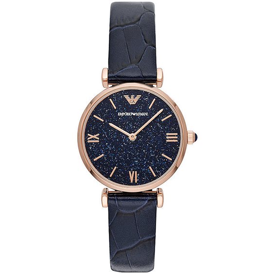 Orologio solo tempo da donna, cassa in acciaio rose gold del diametro di 32 Mm, quadrante blu glitterato, cinturino in pelle nero . Resistente all'acqua 3 atmosfere. Movimento al quarzo.