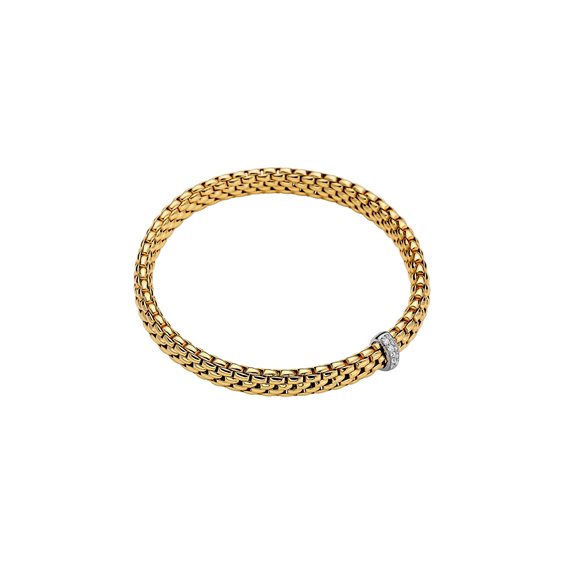 misura M (cm 17) - Bracciale Fope Flex’it collezione Vendôme, in Oro Giallo e Oro Bianco 18 carati. Elemento centrale formato da un anello in oro bianco impreziosito da diamanti bianchi per un totale di 0,10 carati. L’altezza del bracciale è di 6,50 mm, mentre lo spessore 4 mm. Le maglie piatte dell'anello sono state sottoposte ad uno stress test di 12.000 trazioni per garantirne la qualità. Le maglie sono elastiche grazie alla tecnologia Flex’it brevettata Fope, con piccole molle in oro nascoste lungo la maglia. Questo permette una vestibilità comoda e adattabile senza necessità di chiusure.