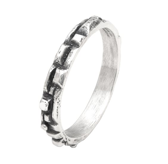 Anello Brick. Questa fedina in argento brunito è essenziale e solida, decorata lungo tutta la superficie con un motivo a mattoncini. La rifinizione in diamantatura regala al gioiello forza, luminosità ed un'estetica fortemente distintiva. Fatto completamente a mano in azienda.