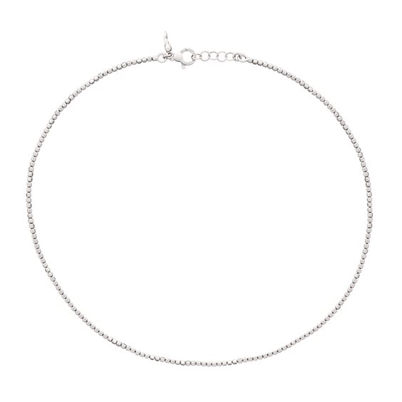 Collana Mini Dadini. Con il suo design minimalista e contemporaneo, è pensata per chi apprezza l'eleganza discreta e la lucentezza pura dell'argento. Fatta interamente a mano in azienda.