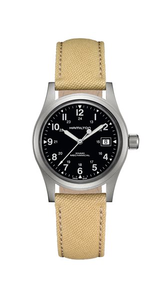 Hamilton Khaki Fiedl Mechanical Orologio da uomo con cassa in acciaio da 38 mm con vetro zaffiro. Cinturino in cordura modello Nato. Movimento a carica manuale con 80 ore di riserva di carica. Un orologio Hamilton da uomo ispirato dai militari, costruito per durare, questo è l'orologio originale del soldato.