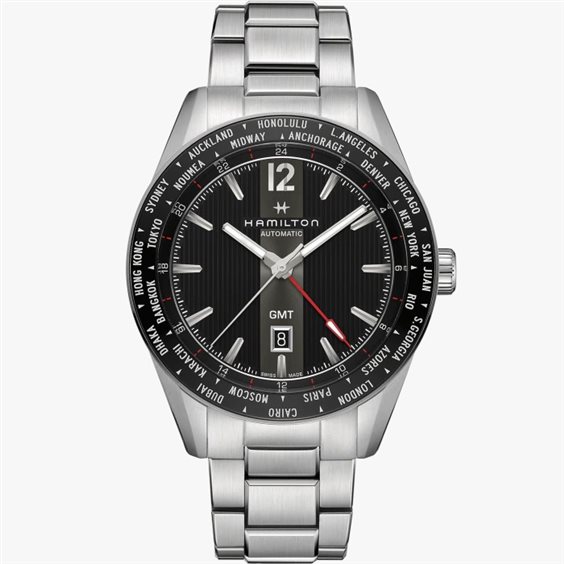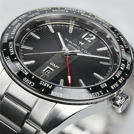 OROLOGIO HAMILTON BROADWAY GMT LIMITED EDITION - MOVIMENTO: automatico Swiss Made - Cal. H-14 - RISERVA DI CARICA: 80 ore - CASSA: in acciaio - Lunetta in ceramica - QUADRANTE: nero - DIAMETRO: 46mm - BRACCIALE: in acciaio - Fibbia deployante - VETRO: zaffiro - FUNZIONI: GMT - Datario - IMPERMEABILITA: 5 Atm/ 50m - GARANZIA UFFICIALE 24 mesi