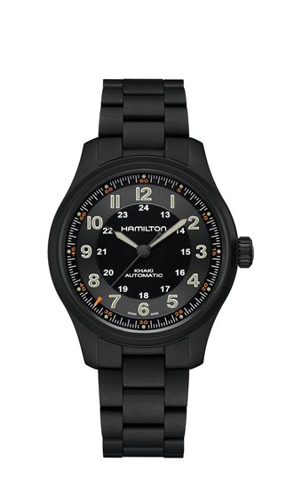 HAMILTON KHAKI FIELD TITANIUM AUTO 42 mm H70665130 L' Hamilton Khaki Field Titanium Auto H70665130 con cassa e bracciale in titanio, entrambi con finitura PVD nera , è un orologio estremamente versatile che può essere indossato in qualsiasi occasione. Il suo quadrante nero con leggibilità ottimizzata ti terrà in movimento in qualsiasi avventura, mentre il suo bracciale ha una finitura spazzolata che aggiunge resistenza e carattere al suo design militare. Combinando funzionalità leggera con stile militare, il Khaki Field Titanium è il tuo compagno affidabile mentre insegui nuove avventure. All'interno della cassa, il movimento meccanico svizzero Hamilton H-10 (basato sull'ETA C07.611 costruito sull'ETA 2824-2) ticchetta in modo affidabile con carica automatica. Funziona a una frequenza di 21.600 semi-frequenze all'ora, ha 25 rubini e, cosa più importante, una riserva di carica estesa di 80 ore . Il funzionamento della macchina può essere osservato attraverso un quadrante trasparente. Il movimento ha anche una funzione di "hacking " e la possibilità di carica manuale con la corona. La spirale di questo movimento è realizzato in lega Nivachron , che è più resistente ai campi magnetici e agli sbalzi di temperatura, garantendo una migliore precisione dell'orologio. La cassa in titanio dell'orologio è completata da un movimento in titanio ben realizzato con una chiusura pieghevole dotata di microregolazione. Il modello si distingue per la sua eccellente leggibilità e la facile chiarezza, che è richiesta negli orologi militari. Il quadrante, che nella sua forma non nega il modello militare, è protetto da un vetro zaffiro . Il vetro zaffiro è un grande vantaggio negli orologi in quanto è quasi impossibile da graffiare. Le lancette e i numeri sono rivestiti con un composto luminescente Super-luminova , che garantisce una luminosità più duratura. Il diametro della cassa di 42 mm rende l'orologio indossabile per la maggior parte dei polsi maschili. La resistenza all'acqua dell'orologio è di 100 m (10 ATM) , quindi può sopportare un maggiore contatto con l'acqua, come il nuoto.