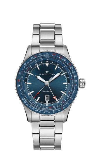 OROLOGIO KHAKI AVIATION CONVERTER AUTO GMT MOVIMENTO: automatico Swiss Made - Calibro H-14 RISERVA DI CARICA: 80 ore QUADRANTE: Blu con indici e lancette luminescenti FONDELLO: a vite con movimento a vista BRACCIALE: in acciaio con fibbia deployante VETRO: zaffiro FUNZIONI: GMT, datario (ore6) GARANZIA UFFICIALE 24 mesi