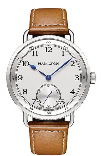 Realizzato in serie limitata a 1.892 pezzi numerati, celebra i 120 anni della consolidata storia di Hamilton. È presentato in una elegante scatola di legno e, con un movimento semplice e rapido, può diventare un orologio da tavolo. Interpretazione contemporanea dei cronometri marini che Hamilton produceva negli anni ’40, ha la cassa in acciaio e il cinturino in pelle marrone impunturata con fibbia tradizionale. Sul quadrante argentato con finiture effetto velluto, numeri arabi dipinti, contatore dei secondi a ore 6 e lancette blu oceano. Vetro zaffiro antiriflesso. Movimento meccanico a carica manuale calibro 6498. Impermeabile fino a 10 atmosfere