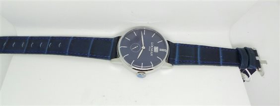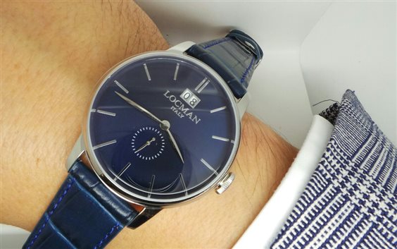 Orologio Locman 1960. Cassa in acciaio mm 40, cinturino in pelle blu stampato, chiusura ardiglione logata. Quadrante blu con indici applicati acciaio, gran data su doppia finestra al 12, secondi alle ore 6. Movimento al quarzo, vetro trattamento zaffiro. Fondello a pressione, possibilità di incisione. Impermeabilità 5 atmosfere. MADE IN ITALY IN CASO DI INCISIONE NON SARA' POSSIBILE IL RESO