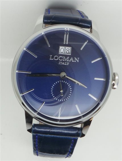 Orologio in acciaio, diametro 41 mm, cinturino in pelle stampata di colore blu con chiusura ardiglione personalizzata, quadrante blu secondi alle ore sei e grand data su doppia finestra, movimento quartz svizzero interamente revisionato dalla scuola italiana orologieria, water resistant 5 atm.Certificato di garanzia