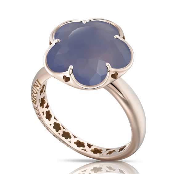 Il fiore a cinque petali è l’icona della Maison e racconta una donna dallo stile di vita elegante, armonioso e ricercato. Una collezione versatile che sa donare note di stile dal sapore romantico e sportivo. Oro rosa 18 kt pietra Calcedonio chiaro