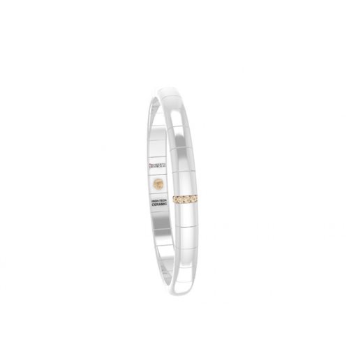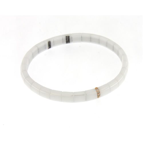 Bracciale estensibile in ceramica bianca lucida, collezione PURA, con 1 inserto in oro rosa 750/°°° e Diamanti Brown. Il bracciale è reso morbido da una doppia molla interna che permette di indossarli comodamente ogni giorno. Tutti i gioielli Roberto Demeglio hanno una garanzia a vita contro l'usura delle molle e degli elementi in ceramica
